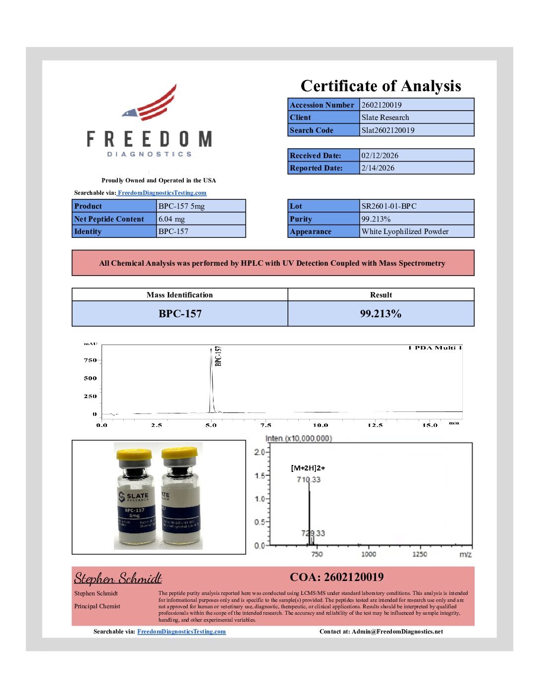 BPC-157 by Slate Research is a high-purity, lyophilized research peptide manufactured under controlled conditions to ensure batch consistency, stability, and reliability. Each vial is sealed in sterile glass to preserve compound integrity during storage and handling.